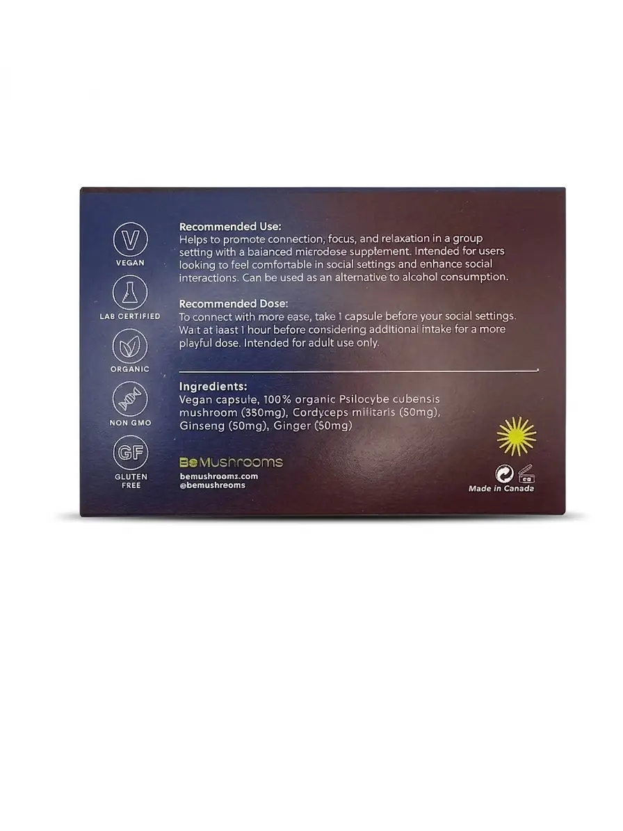 Unlike traditional microdose capsules designed for daily wellness protocols, Be Connected delivers a moderate 350mg dose of organic Psilocybe Cubensis in each capsule. This is paired with three carefully selected adaptogens that complement the social experience: