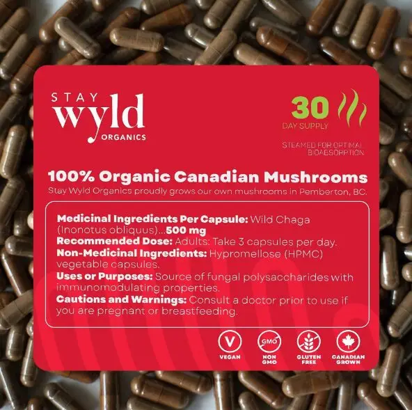 Stay Wyld Chaga medicinal mushroom capsules are loaded with Wild Canadian Chaga Fruiting Bodies. The addition of Wild Chaga introduces Betulinic acid into the capsules. Our Chaga mushroom capsules make it easy to control dosage on a regimented schedule, or maybe you’re not as big a fan of mushroom flavor as we are but you love the benefits. We’ve got you. We’ve got Chaga capsules.