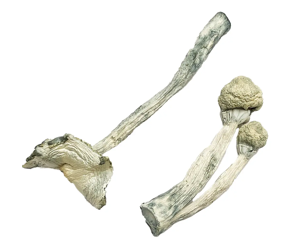 The True Albino Teachers are small to medium sized mushrooms with round caps that open to a medium size. The caps and stems are pale, colourless and white. Stems are often bruised when touched prior to drying. Where human hands touched during the harvest process, you’ll often find blueing.